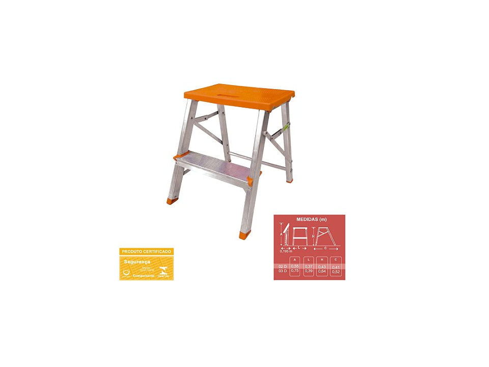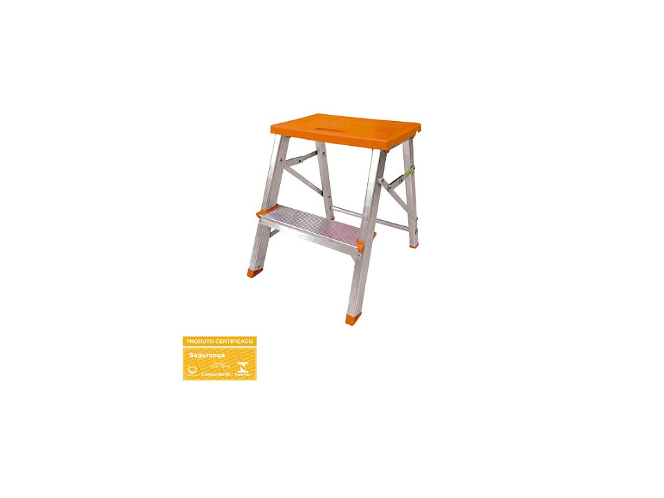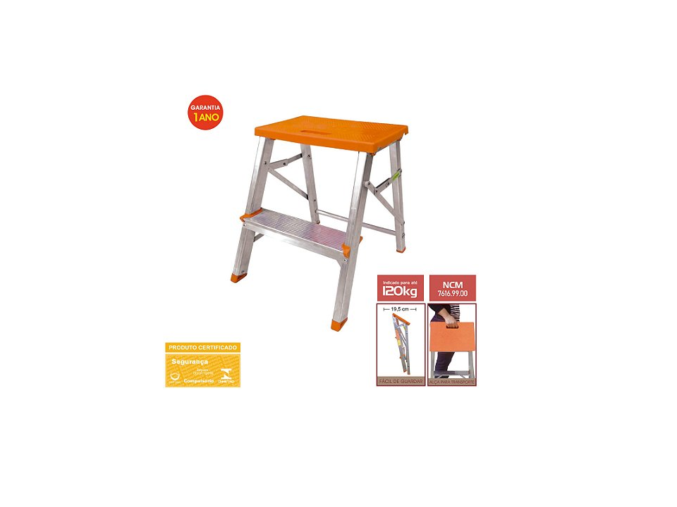 Possui patamar laranja de polipropileno altamente resistente, travas de segurança, sapatas antiderrapantes e seus degraus largos proporcionam conforto ao usuário.