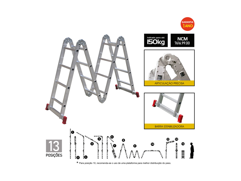 Articulações precisas com travamento automático, barras estabilizadoras para melhor fixação e degraus antiderrapantes com maior área de contato.