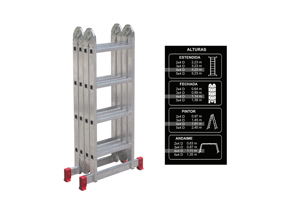 Escada Multifunção Articulada 4×4 degraus (4 sessões de 4 degraus), em alumínio, leve e fácil de transportar, pode ser utilizada estendida, como andaime, na posição de pintor e em outras 10 posições.